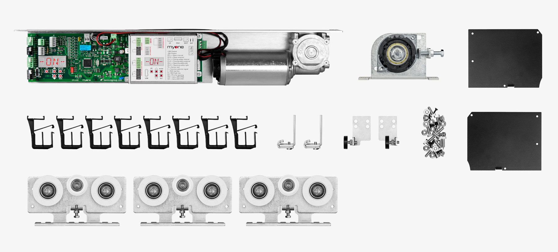 motorreductor con encoder y central electrónica de mando | reenvío de la correa | guías pasacables | carros de deslizamiento de tres ruedas | herraje de fijación de la correa | topes mecánicos de final de carrera | kit de tornillos | cabezales laterales